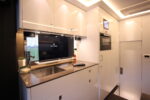 You enter the living area of the RR6 Top Class Line through a separate hall or entrance with a luxurious floor. The walls and ceiling are finished in a way that seamlessly matches the living area. On the photos you can see the “special” interior of the RR6, where you do not have a separate hall but a larger kitchen and living room.